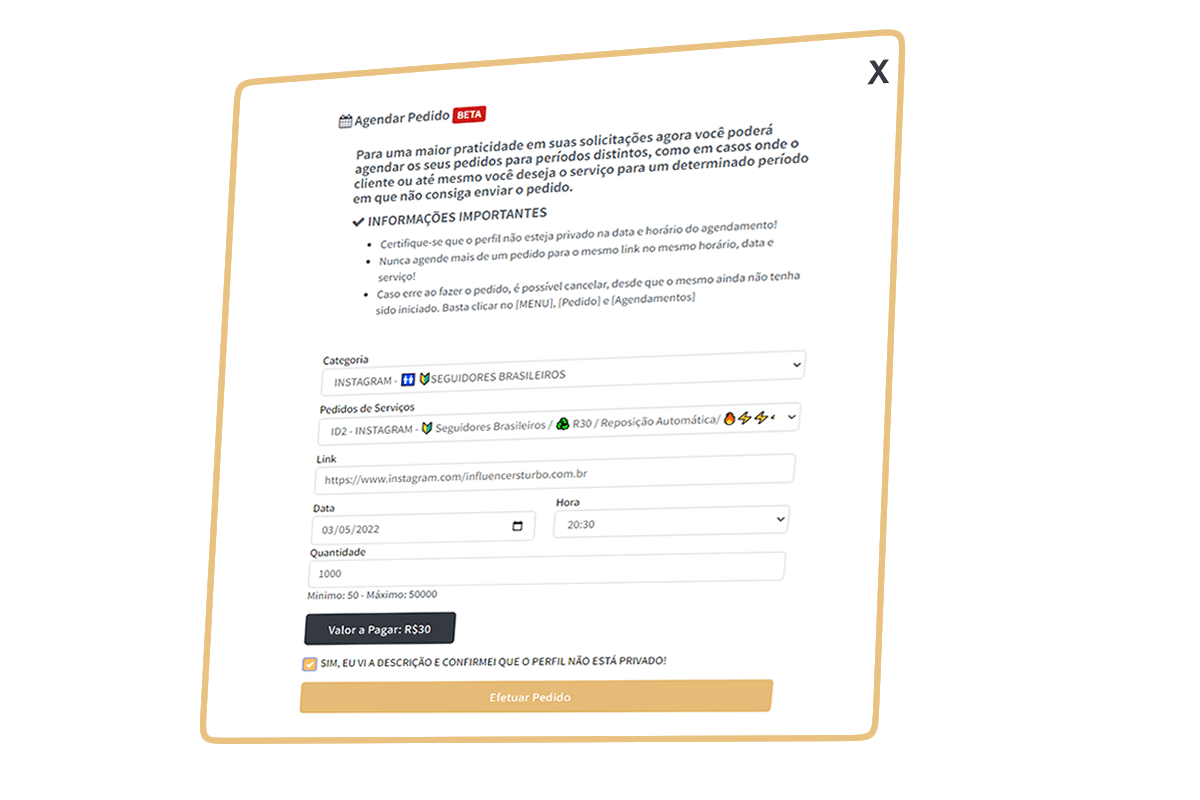 Contamos com um sistema de agendamento de pedidos onde você tem a opção de escolher o serviço, data e horário que o mesmo será executado pelo sistema, trazendo comodidade para você e o seu cliente!